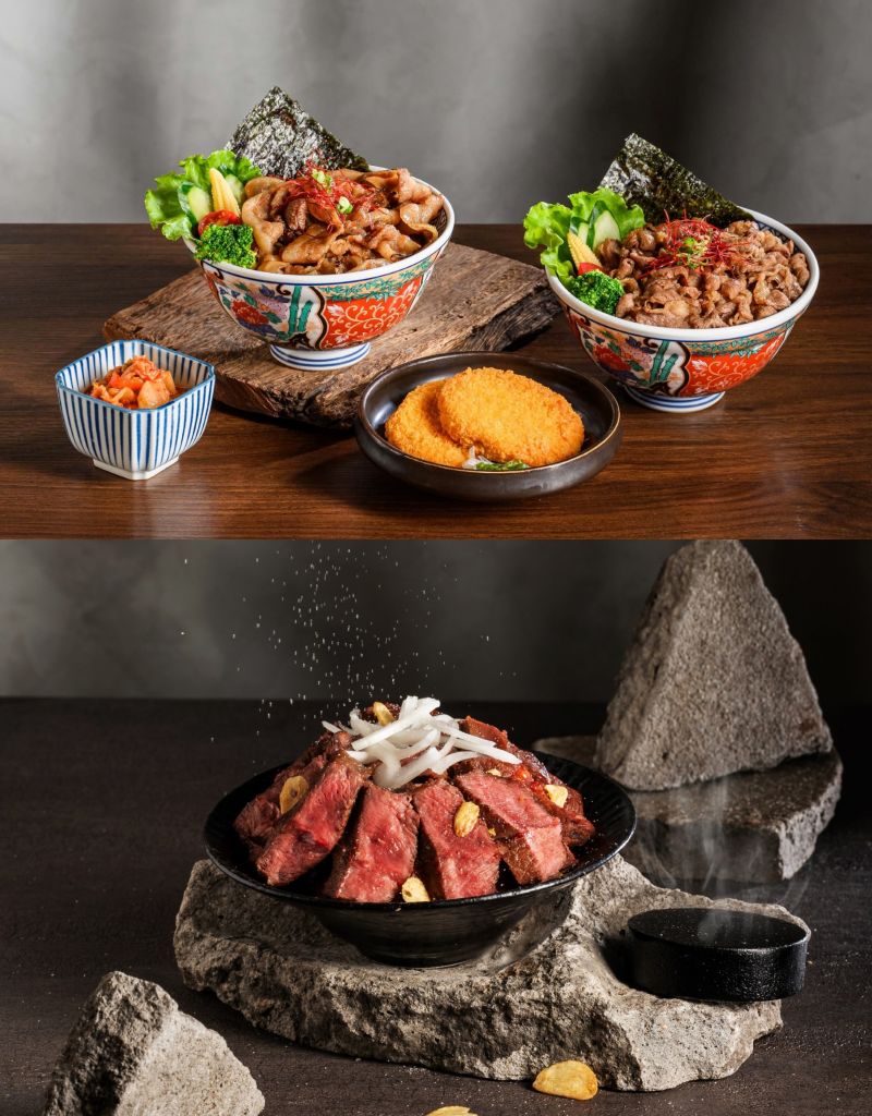 宮本武丼2款招牌燒肉丼,澎湃130g火烤美味肉山,堪稱同級最大份量,超澎湃銷魂,收服肉控味蕾。「宮本野牛丼」以直火快準疾烤,將難以駕馭的1.5mm牛肉薄片,變成肉嫩味美燒肉山,搭配獨門沾醬無法抗拒,曾創下單月破萬碗銷售量。「作州野豬丼」以直火炙燒,肥嫩豬五花油脂散發撲鼻香氣,加上油亮醬色燒肉醬超誘人。