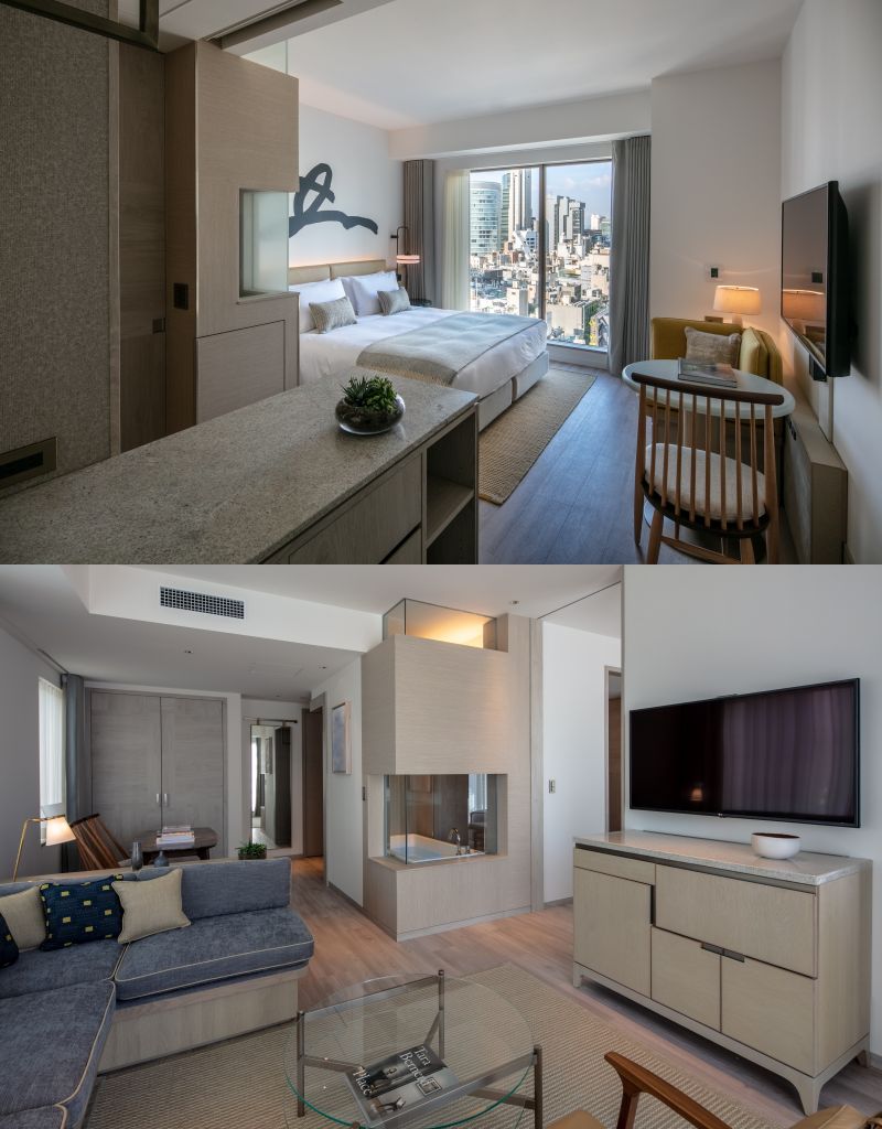 Tara Bernerd & Partners將日本傳統飲食文化(尤其是便當)精髓與現代設計方法完美結合,巧妙融會貫通在ZENTIS OSAKA客房中,展現對日本空間美學的深刻理解。棱角分明的佈局劃分了各個區域,使空間更實用,確保整個空間的流動性。浴室牆身鋪上薄薄冷灰色瓷磚,聯想到酒店吧台的日式出雲Izumo瓷磚,營造視覺上的聯繫及和諧感。