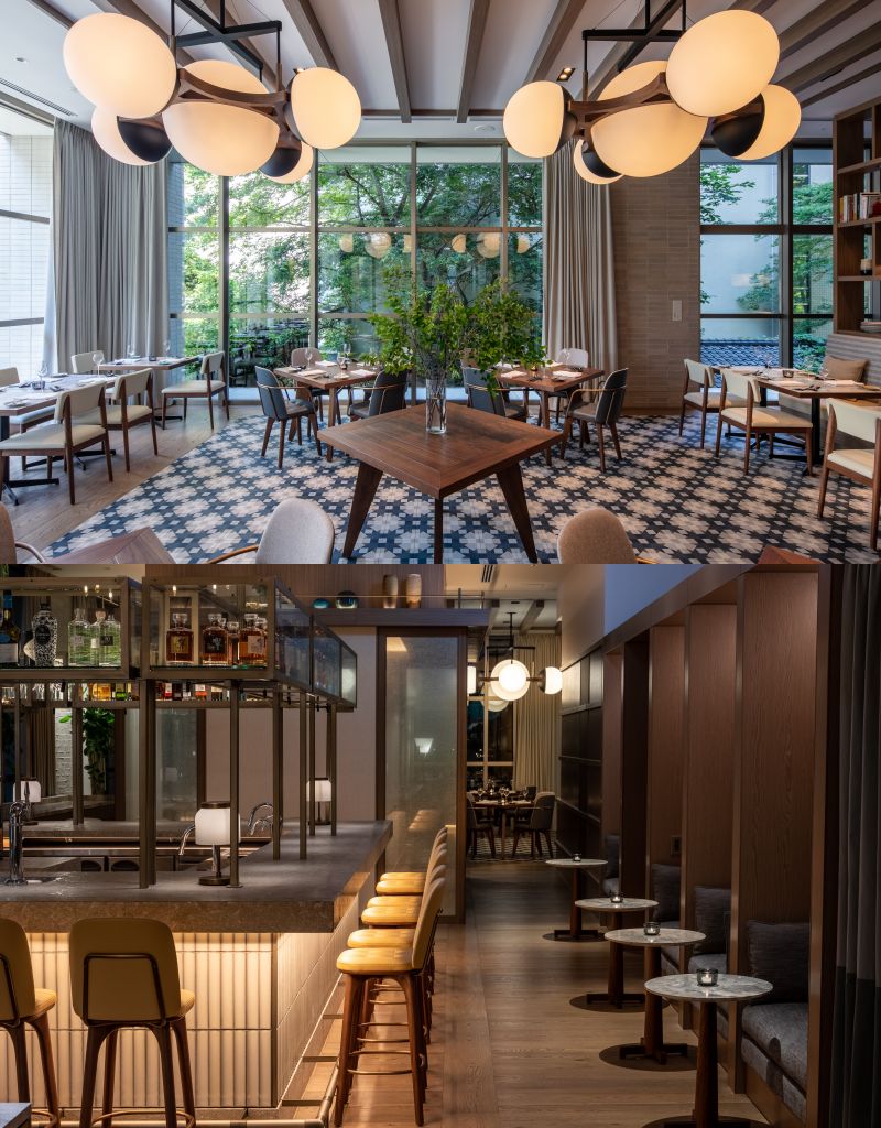 ZENTIS OSAKA完美糅合室內與室外空間設計,Tara Bernerd & Partners利用從1樓延伸至2樓的落地窗花,在各個用餐區間製造視覺連續性,創造一道流暢無縫的空間感,可見到磚砌結構、木樑、綺柏石、鐵藝,及搶眼藍色石灰石樓梯。室內使用灰褐色與白色暖色調,與樓梯互相映襯,加上鋼藍、蜂蜜色、暗棕紅色與鼠尾草綠色點綴,無形中增添泛泛的層次感與特色,中世紀風格燈飾營造出工業時尚與低調奢華感。