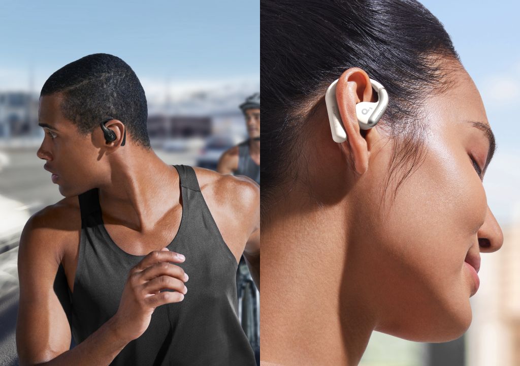 soundcore首款"開放式氣傳導"耳機AeroFit及旗艦版本AeroFit Pro,皆採用開放式氣傳導技術,不入耳設計只覆蓋耳孔上半部分,減低封閉感與壓力感,耳機表面使用彈性柔軟材料,防止因長時間配戴疼痛,達到無與倫比的舒適性,維持對外界聲音感知確保行動安全。透過空氣介質傳遞聲波降低聲波減損,創造更接近原聲音質,定向聲學技術避免產生漏音。