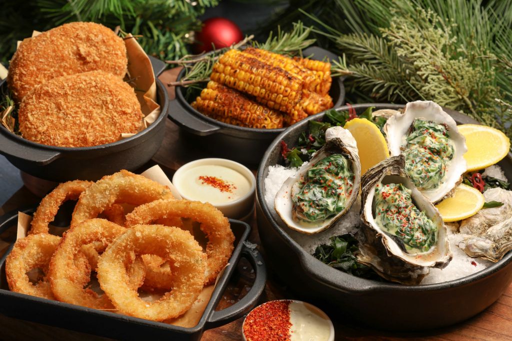 主廚還精心設計3款配菜及4款開胃菜,搭配加長型美國帶骨牛小排點用,除了將法國新鮮直送的生蠔佐以黃檸檬切片直接鮮活上桌選項,也推出美國紐奧良經典名菜”洛克斐勒烤生蠔”,料理時先在肥美牡蠣鋪滿黃油煎過的脆培根碎,再淋上菠菜、西洋菜、巴西里、芹菜與塔巴斯科辣椒醬做成辛香醬料,放入烤箱燒烤前鋪上厚厚切達起司,同時感受到濃郁醬香、牡蠣鮮香與培根油香等3重滋味。