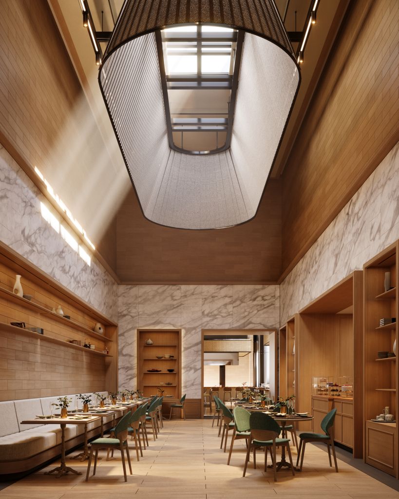 JANU TOKYO高挑舒朗的大廳與接待處,運用玻璃與紋理設計折射柔和與明亮光線賦予空間感。天花板上方點綴繁複精細花格木飾與成排編織繩拱門,從繁華街道自然銜接至JANU靈魂之處。設有122間明亮通透的客房與套房、8間餐飲場所、2間精品店及佔地4000平方米最新理念康養中心