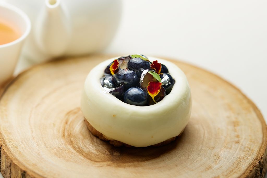 「藍莓小蛋糕」濃郁奶香的乳酪蛋糕體,呈現清爽風味,藍莓果餡加黑醋栗提味,讓口感有了新的層次,特別加上南法圖爾可食紫羅蘭花提味,柔和與浪漫氣息,彷彿置身於南法的大自然中。