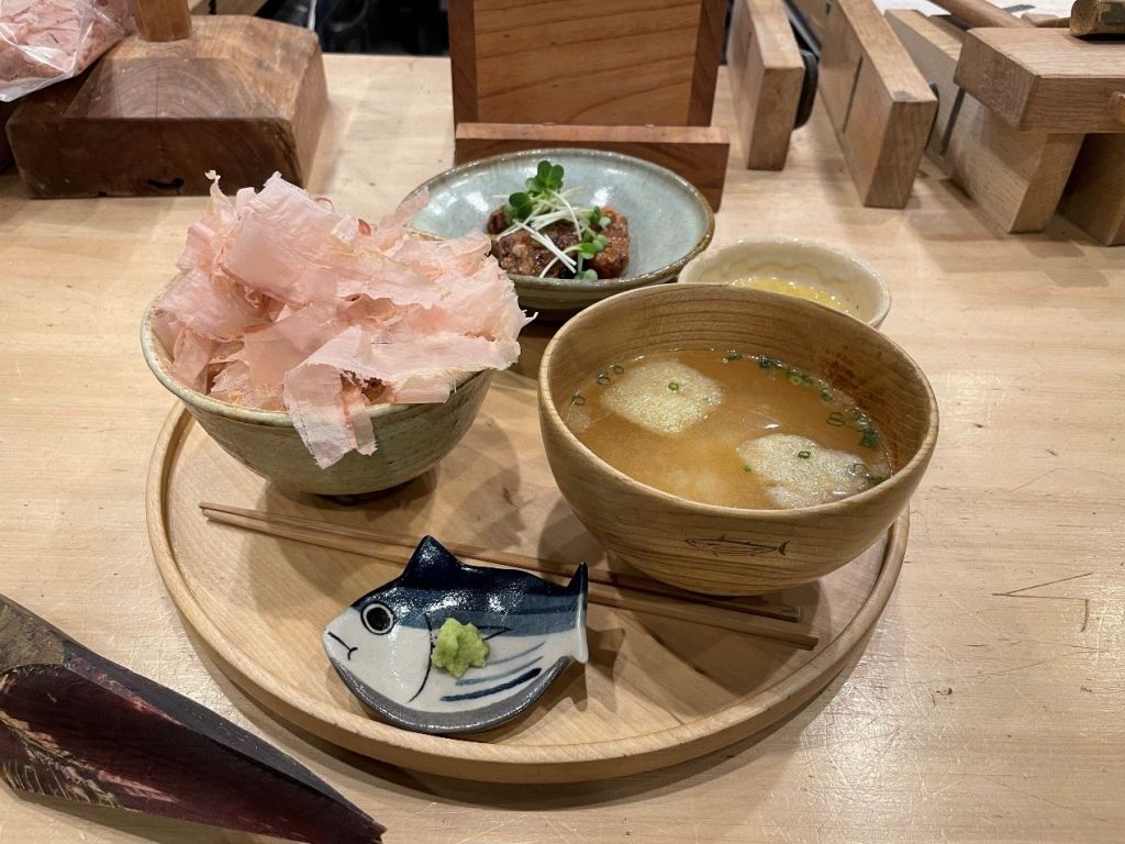 點餐後店主會親自在客人面前把柴魚刨成片狀,鋪在熱騰騰白飯。可不加任何調味單純享受柴魚與白米融合美味、灑上少許鹽提味、淋上些許日式醬油、或加購新鮮生蛋打在白飯,層層堆疊搭配讓食材相輔相成。簡單美味感受難以忘懷。