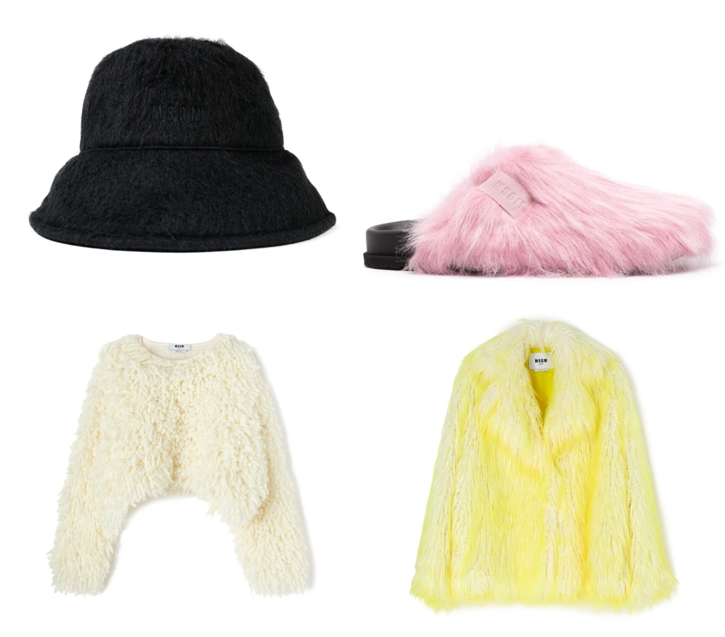 義大利高端潮流品牌MSGM秋冬女裝系列推出多款人造皮草單品,蓬鬆羊毛與布料搭配,應用在許多服飾及鞋帽等配件,軟萌毛毛觸感超療癒! LOGO皮草漁夫帽、粉色皮草拖鞋、黃色皮草外套、羊毛短版上衣,搶眼電光黃、太妃粉穿插點亮系列,充滿魅力,展現一場奇異、虛幻的白日夢境。