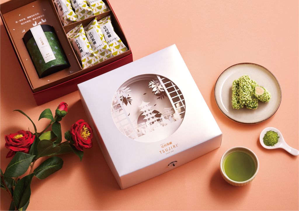 官網獨家薩摩抹茶煎茶搭配辻利抹茶杏仁捲售,金色禮盒繪有日式七寶紋飾,象徵歡慶喜悅。盒蓋以台灣紙雕藝術描繪京都月光下,倚著樹影美景,與靈巧小兔,一同茶敘歡慶。食用完畢還能華麗變身小夜燈,為生活空間妝點藝術氣息。