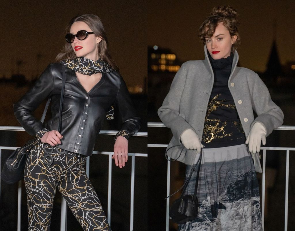 獨特金屬色印花能輕易詮釋出個人風格,上衣金色街道燈飾圖案,下半身搭襯材質飄逸經典Photoprints半身裙,滿版印花來自設計師Agnès拍攝的風景照片,藉由與金屬光澤上衣配搭,在視覺更顯層次,詮釋出個人獨特風格,成為全場注目焦點。