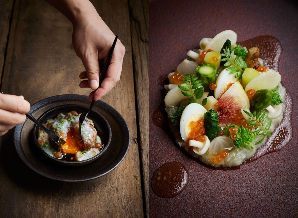 “鱒卵茄泥冬蔬"由15種冬季蔬菜組成,主廚將帶著堅果香氣的超級食材菊芋,搭配鮮甜Q彈鱒魚卵、冬筍、高海拔山區的塔菇菜與日本花菜,僅以海鹽與橄欖油調味,宛如在舌尖跳起小步舞曲,帶出各自質感與清甜。