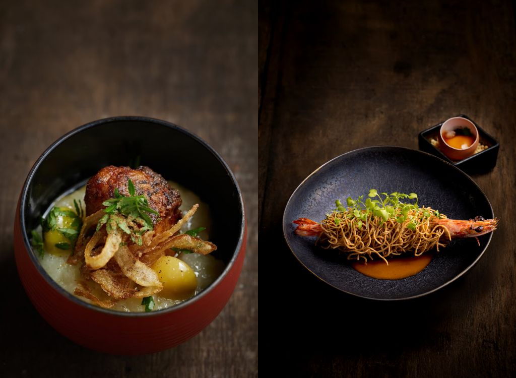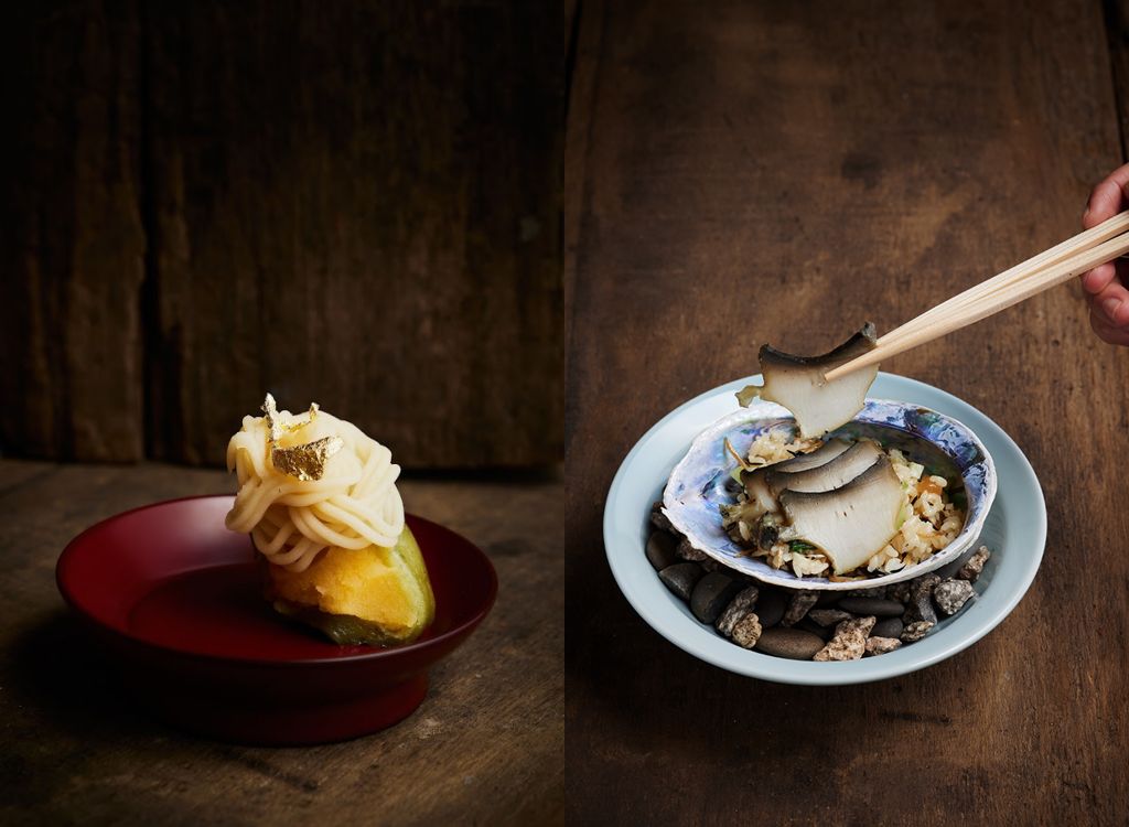 主廚引進冬天之王京都的聖護院蕪菁、超級食材菊芋、藏在冰河下的圓鱈、宜蘭捕撈直送野生明蝦、藥膳珍寶烏骨雞、日本A5和牛、紐西蘭國寶級黑金鮑魚等極致食材,精妙運用不同地域的風味聚集堆疊。