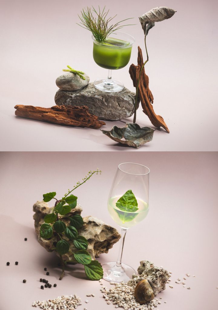 海洋以台灣四面環海為靈感,萃取新鮮蛤蠣取汁呈現鹹鮮感,加入接骨木花利口酒增添小白花香,以新鮮馬告、檸檬與薑帶出辛香風味。晶瑩透徹的酒體呈現海洋意象,再點綴甜羅勒葉增添草本香氣。