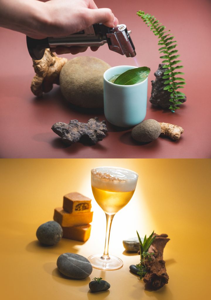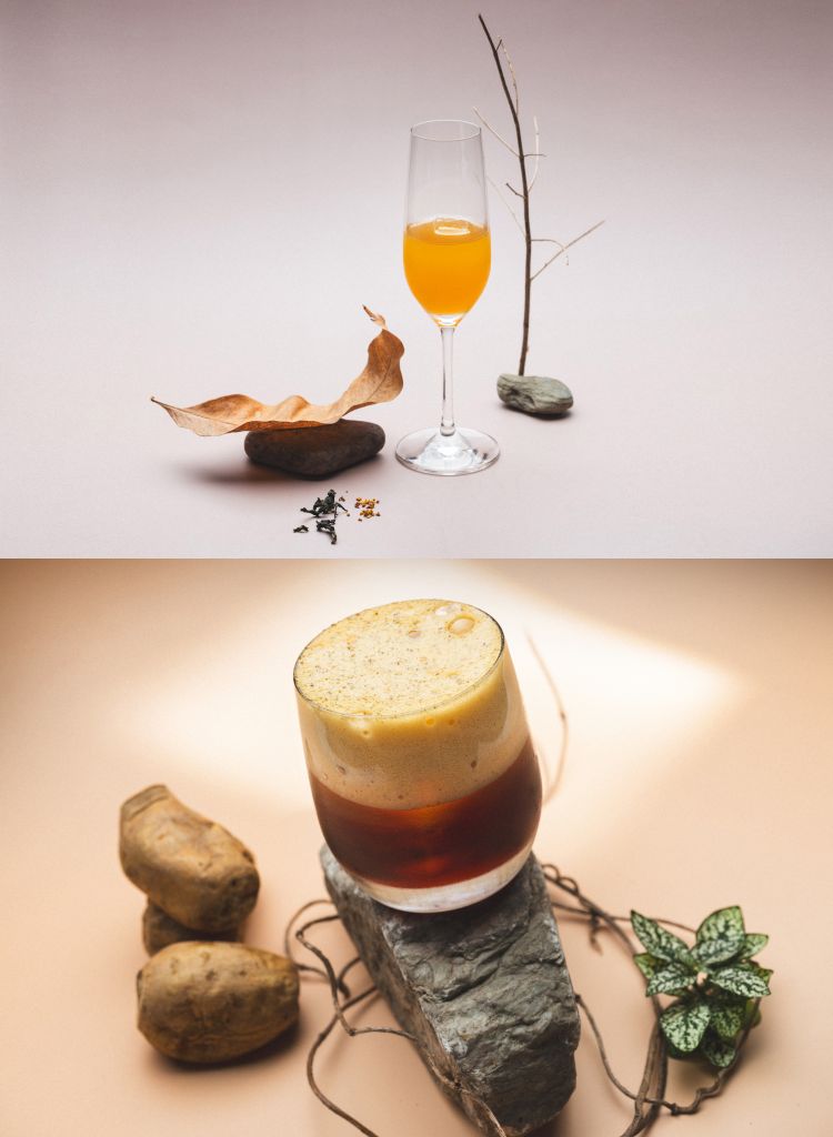 窯烤地瓜下層使用新鮮鳳梨萃取帶出鮮明酸度,以台灣黑糖呈現甜度。基酒為煙燻與木質調蘇格蘭威士忌,加入剝皮辣椒增添辛辣感。上層加入帶皮熟地瓜、龍眼蜂蜜、泥煤威士忌、牛奶與鮮奶油製成的泡沫,創造豐富的土壤氣息與地瓜澱粉的濃稠口感。