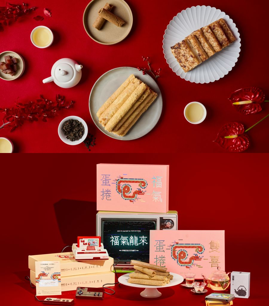 TASTE by MMHG跟上Y2K 風潮,以復古電玩遊戲為主題,推出3款”福氣龍來新年蛋捲禮盒”,福氣蛋捲以冠軍烏魚子打造奢侈海味,烏魚子蛋捲每口都能嚐到濃郁蛋香及烏魚子鮮美甘醇。攜手精品茶館萃釅AINSI THÉ研發新款紅茶蛋捲,奶香馥郁,輕盈酥脆不膩口。