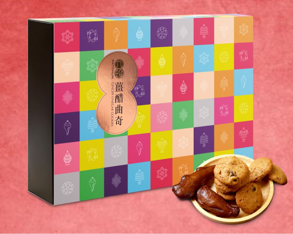 八珍薑醋餅乾禮盒,用馳名的甜醋薑手工巧製成薑醋餅乾,薑粒甜而不辣,濃郁老薑在口中瀰漫,甜而微辛口感在寒冷冬天裡,帶來一點溫暖人心的味蕾饗宴,是中西合璧美食代表。八珍尊貴禮盒集結八珍經典商品,內含XO醬、八寶醬、濃釀生抽,是送禮最佳選擇。