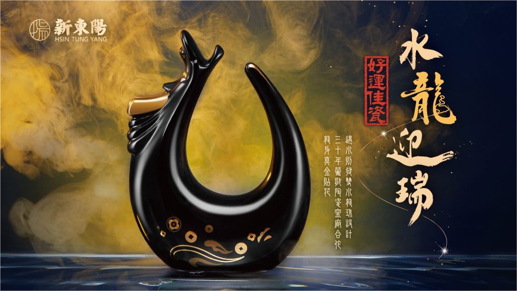 新東陽HSIN TUNG YANG生肖瓷器禮盒龍年再推新作,與台灣在地鶯歌陶瓷名廠合作,將十二生肖文化結合國寶級精緻瓷器工藝,以簡潔流線型黑水龍王設計,龍王飛躍於水面並仰天展望,完美傳遞”風生水起、好運佳瓷”祝福寓意,讓新的一年,財運及好運加持一波,收穫豐沛,財源滾滾來!