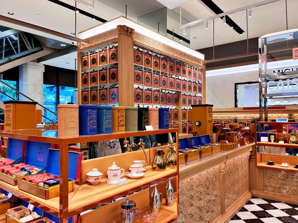 精緻的咖啡吧檯最多可容納14位客人,向每杯咖啡精緻鑑賞與精湛技藝致敬。在夿萐咖啡BACHA COFFEE精品店內盡情瀏覽時,可欣賞琥珀色罐子在高處閃閃發光,飄散的芳香喚起五種感官的奇幻體驗。