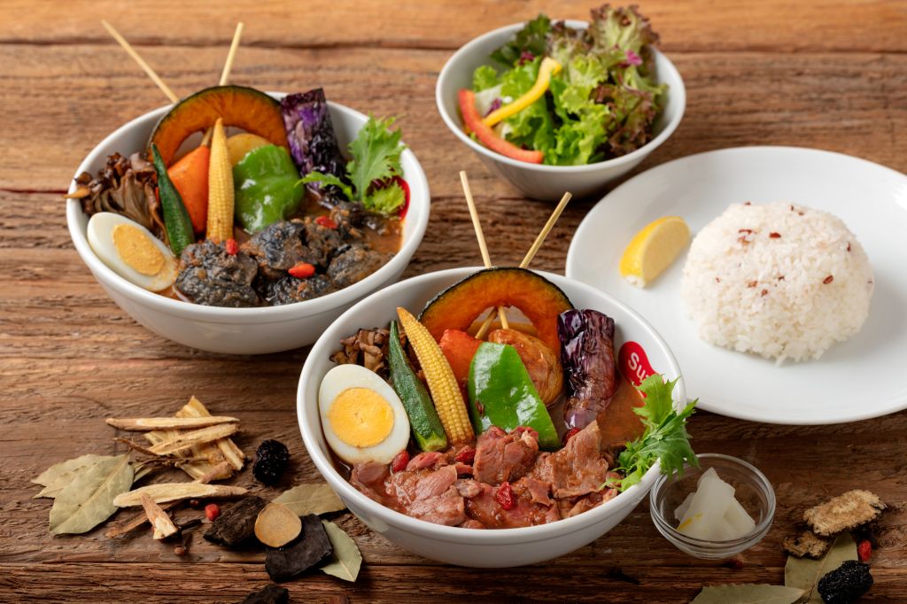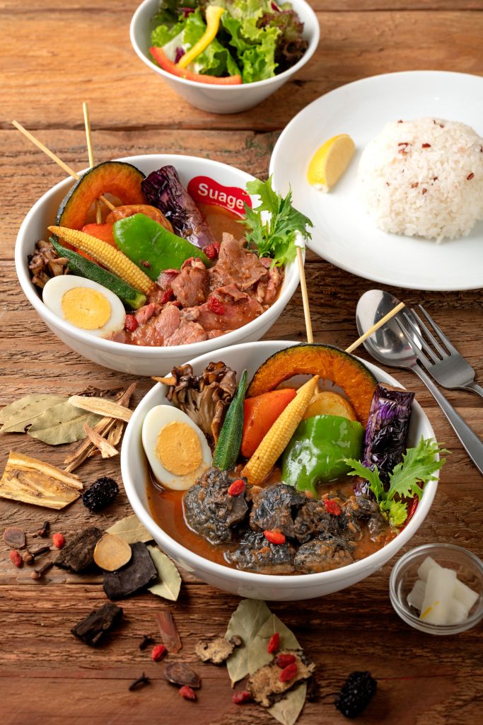 日本Suage北海道湯咖哩賣起台式進補藥膳,料理長將日本流行”大人新習慣”的藥膳湯咖哩風潮帶進台灣,以台式藥膳常見的當歸、黃耆、枸杞等藥材加入日本直輸來台原味湯咖哩燉煮,推出台灣首見進補系湯咖哩"烏骨雞藥膳湯咖哩"、"舒肥翼板牛藥膳湯咖哩",為寒冬捎來進補暖身美味。