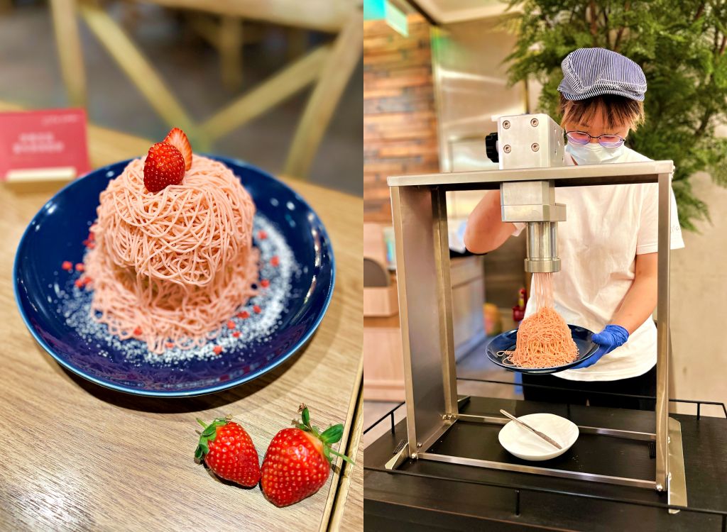 現點現做伊勢草莓蒙布朗薄鬆餅,使用大量數量珍稀的伊勢產章姬草莓,結合台灣豆沙、北海道鮮奶油製作草莓蒙布朗餡,透過日本進口專業蒙布朗設備擠出1.5mm細緻草莓蒙布朗餡,天然芬芳且香氣濃郁,頂層點綴整顆台灣草莓、撒上草莓果乾等裝飾,為草莓蒙布朗鬆餅帶來奢華美味。
