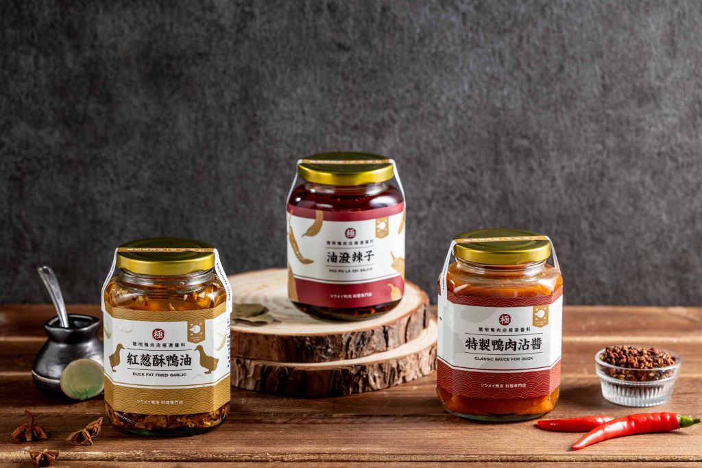 聰明極選醬料系列三寶:紅蔥酥鴨油、油潑辣子、特製鴨肉沾醬3款醬汁深受饕客喜愛,在老客人建議下裝罐販售,濃情鴨香,讓遊子在世界各地都能帶著熟悉的家鄉味。