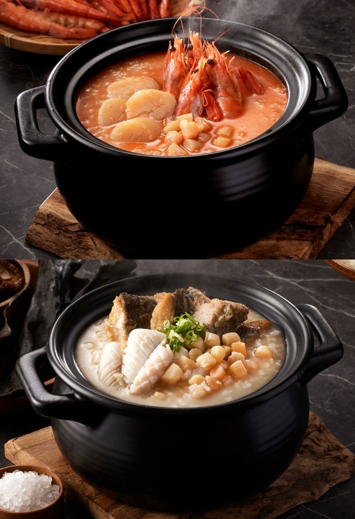 朝粥幫首創金龍、銀鳳及琥珀3大粥底亮點。熱愛海鮮狂粉必點金龍粥底,粥底以1斤蝦子熬煉,佐干貝、鮮蝦熬煮,濃醇海味大爆發。銀鳳粥底嚴選國產土雞,以文火清燉慢熬數小時,淬鍊銀白高湯,湯頭味甘性溫,清甜順口。偏愛淡雅鮮味鐵粉可挑選琥珀粥底,以特級昆布鹹鮮提味、口味細緻甘甜,襯托海鮮食材原汁原味。