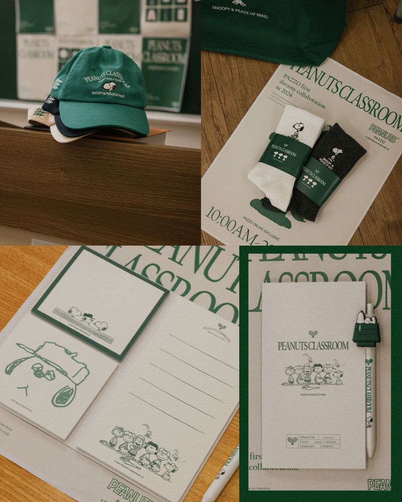 PAZZO╳SNOOPY夢幻聯名PEANUTS CLASSROOM系列推出男女共穿的毛衣、帽TEE、衛衣、襪子及棒球帽,主題週邊小物加入餐盤、馬克杯、筆記本、原子筆及托特包,還可加價購SNOOPY鑰匙圈吊飾,以中性復古綠點綴日常服飾與生活小物,風格注入了一點古靈精怪與休閒個性,將療癒氛圍感染每個生活細節。