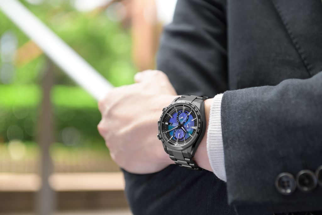 台灣隊長2.0拿莫.伊漾佩戴光動能全球電波對時錶HAKUTO-R限定錶款AT8285-68Z,錶盤採用FUJIFILM公司結構色墨水技術,環保材質錶盤上層呈現銀色閃光設計,由藍到紫的漸層宛如星雲般多變美麗。超級鈦錶殼經DLC高耐磨處理,展現宇宙般深邃神秘面貌。