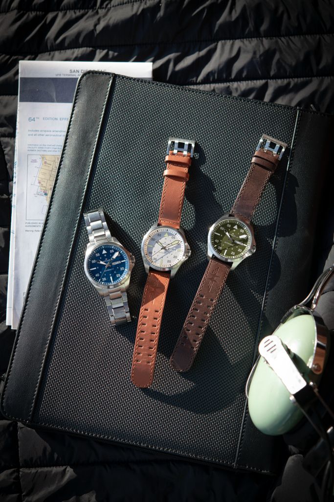 3個比例勻稱的42毫米腕錶具備星期與日期窗口、鍍鎳時針與秒針。精鋼錶帶搭配飽和度高藍色錶盤聯想到晴朗開闊的天空。淺色皮革與銀色錶盤經典航空風組合想起早期特技飛行,深色皮革與綠色錶盤搭配則致敬卡其系列戶外冒險起源。