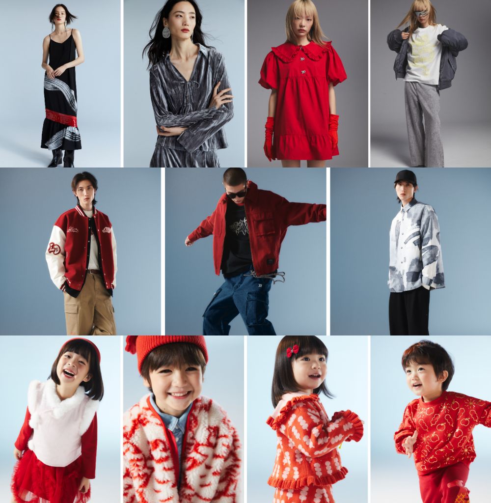 童裝系列捕捉遊龍、絢爛煙火與糖葫蘆等新年標誌,結合緞面背心、泰迪絨外套、小洋裝等單品,使純真童趣無限蔓延。盤扣與唐裝等傳統東方元素與格紋、印花、荷葉邊相遇,釋放稚真童心。紅色雲朵包及卡通祥龍形象配件的點綴讓整體造型更豐富,以滿滿元氣奔向璀璨的新春篇章。