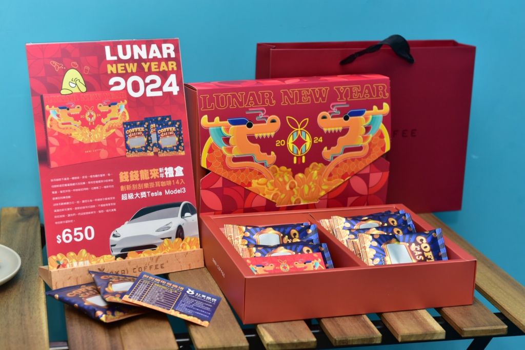 錢錢龍來新年禮盒內含獨家首創"刮刮樂濾掛包",以獨家包裝技術將過年必玩刮刮樂印在濾掛包包裝,讓客人在沖煮咖啡之餘還能玩刮刮樂盡興,趣味十足。超狂最大獎為TESLA特斯拉MODEL3 LR一台,適合新年試手氣。