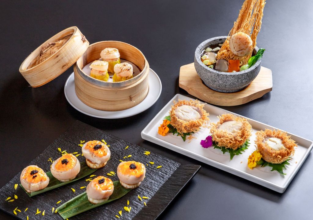 桃花林中國料理餐廳王建榮主廚特別選用生鮮北海道生食級干貝,主打干貝等級再升級等4道料理。煎焗北海道干貝廣生面號稱飛天麵,以廣東炒麵為創意發想,搭配約50公克重北海道冷藏生食級干貝2顆,象徵2024新年開春船揚起帆,好運一飛沖天。
