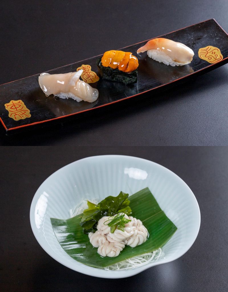 山里日本料理和食區、鐵板燒區、天婦羅區及壽司區各推出2~4道日本海產料理。鐵板燒區、天婦羅區及壽司區吧檯分別以各式豐富日本水產打造鱈魚白子壽司、西太公魚天婦羅、山藥鱈魚白子鐵板燒、干貝海膽紫蘇卷及厚岸生蠔等美饌,並可跨區點選指定料理享用,盡情沉醉於北海道干貝、鱈場蟹、海膽及生蠔等新鮮水產美味中。