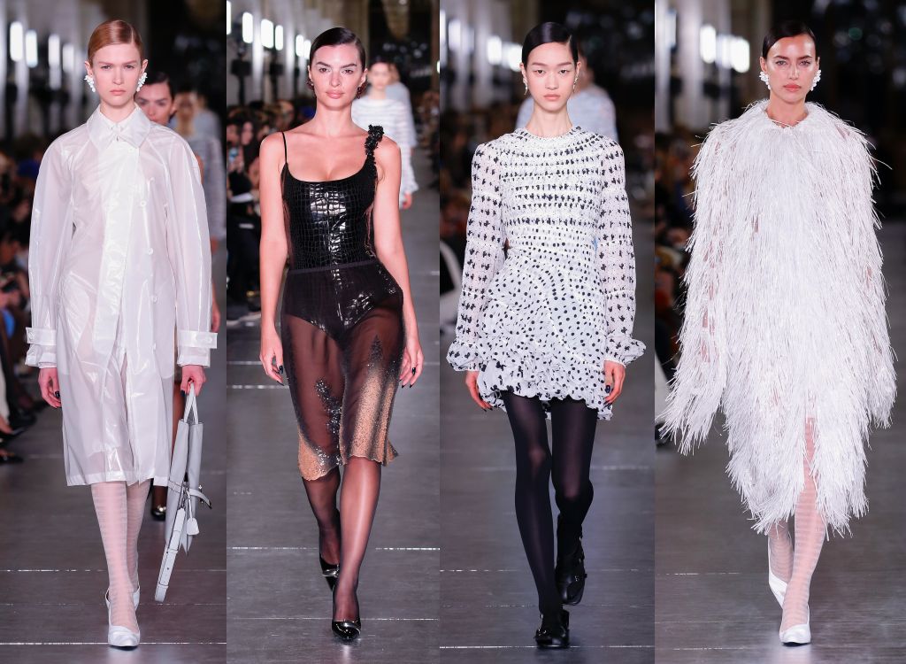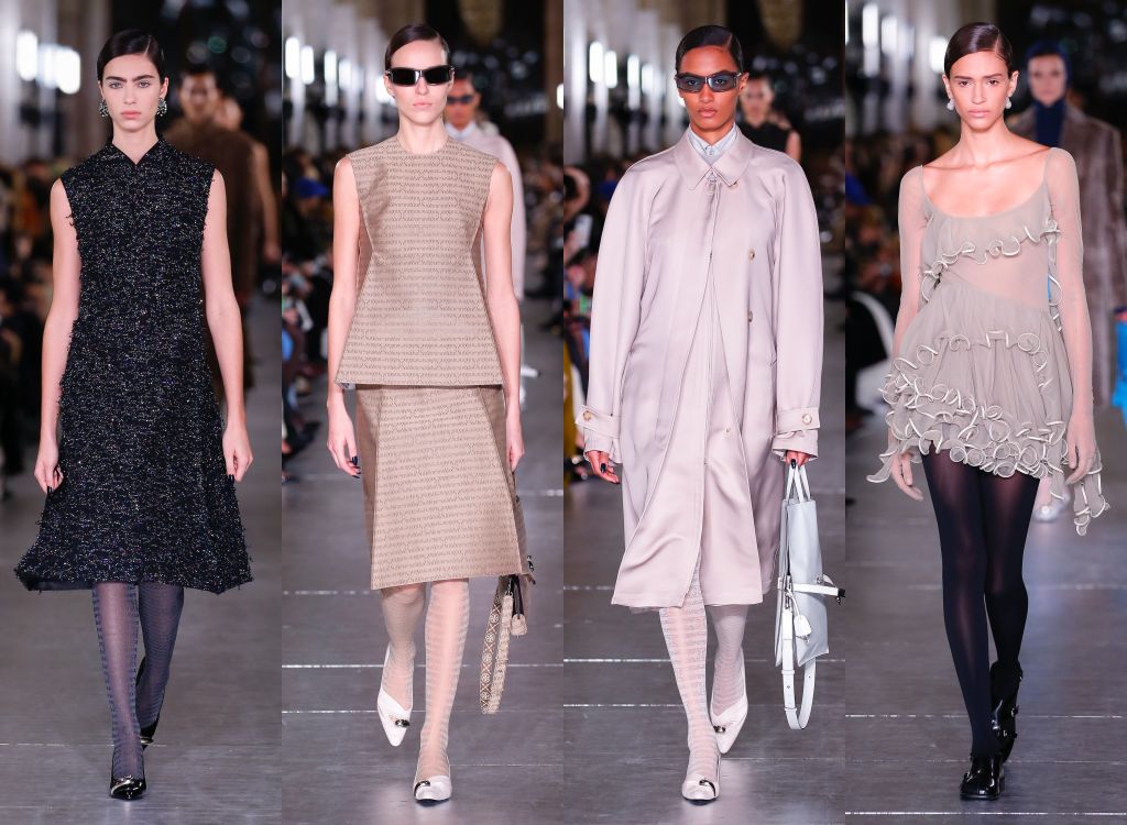 廓形:棱角分明的連身裙與半身裙借鑒了燈罩的幾何美感,煥新演繹柔軟廓形。熟悉的日常單品,如夾克、褲裝、襯裙、連帽衫與風衣等,從面料、比例與技術層面進行重塑。點綴手繪亮片的透明半身裙及飾有褶襇的針織網眼連身裙綻放性感魅力。
