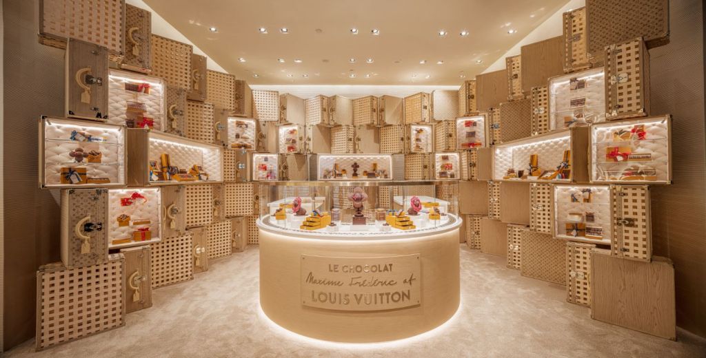 路易威登開設全球海外首間MARINA BAY SANDS SINGAPORE新加坡濱海灣金沙Le Chocolat Maxime Frédéric At Louis Vuitton巧克力專門店,提供多款以路易威登設計元素為靈感的巧克力商品,並使用路易威登經典包裝盒包裝。