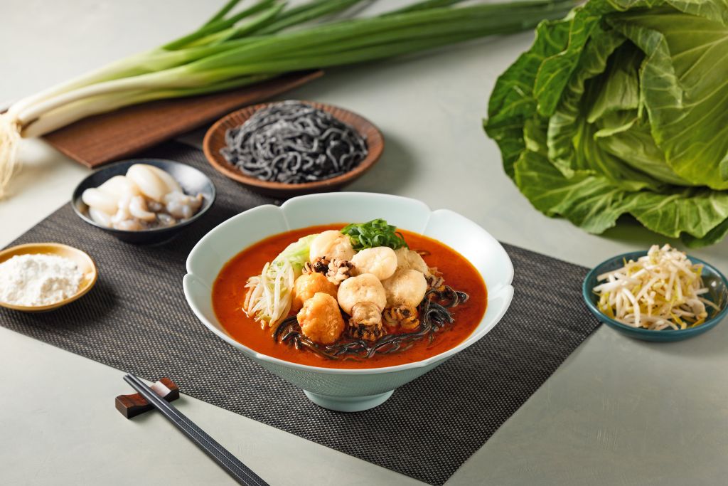 全新口味花黑PUN拉麵東洋味十足,以招牌蝦皇湯為湯底,老母雞及雞腳強化天然膠與濃醇,整尾頂級老虎蝦烘烤後打碎加入提味添香,特製極細墨魚汁拉麵色澤烏亮,配料魚子蝦滑與裹粉酥炸小花枝, 整碗麵香濃滑順,渾厚湯頭搭配彈牙蝦滑與外酥內嫩小花枝,在舌尖共振出愉悅的美味重擊。