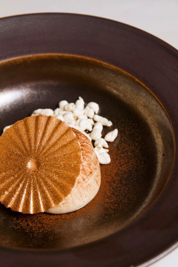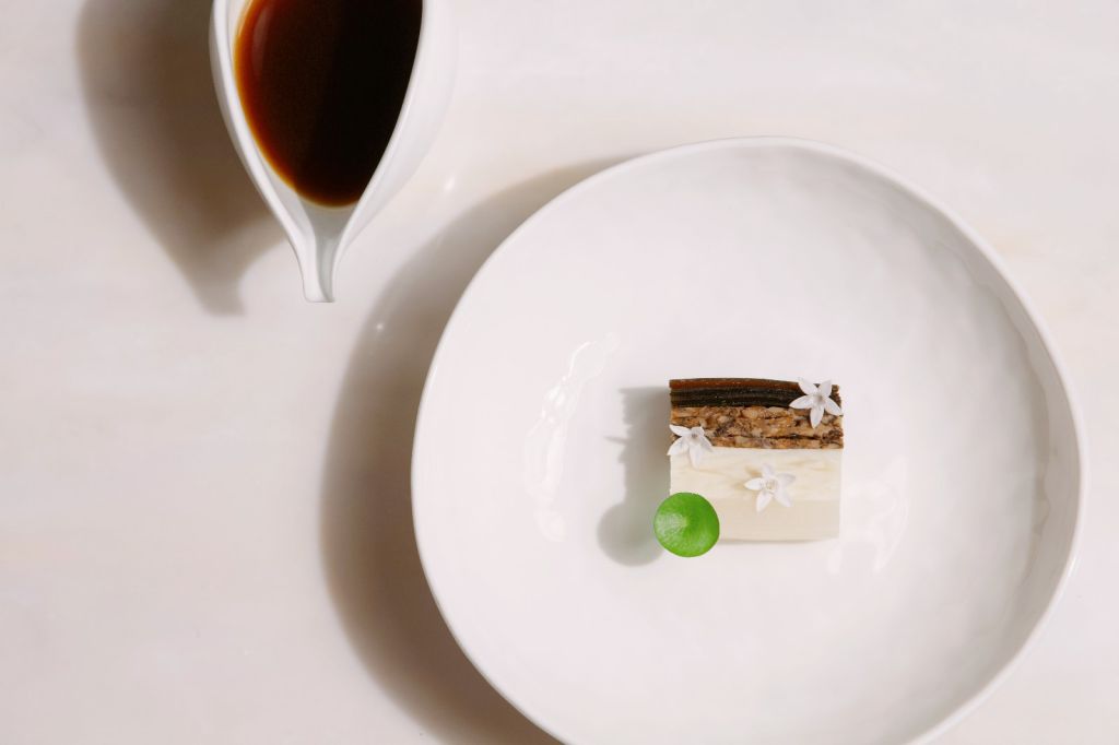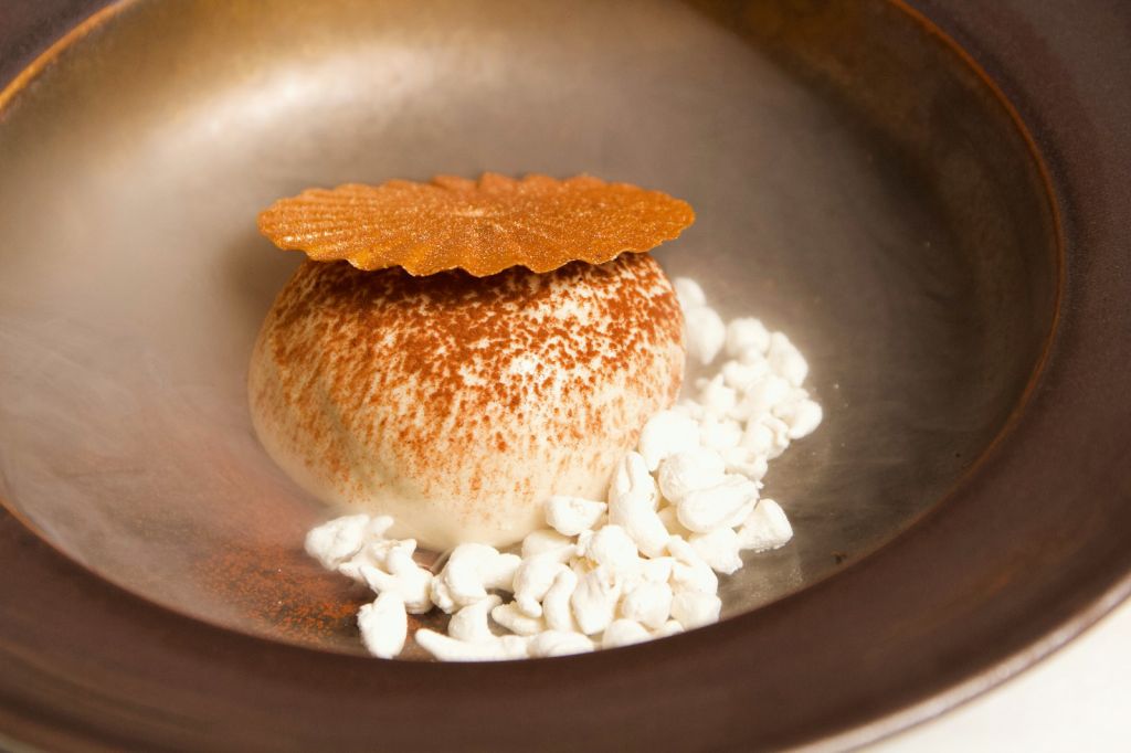 《La Dolce Vita生活的甜蜜》使用義大利經典甜點提拉米蘇為基底做元素堆疊,加入沙巴雍做成蛋酒冰淇淋,佐以白色煙霧與金色閃耀脆片,象徵電影裡甜蜜浮華又放縱的生活。