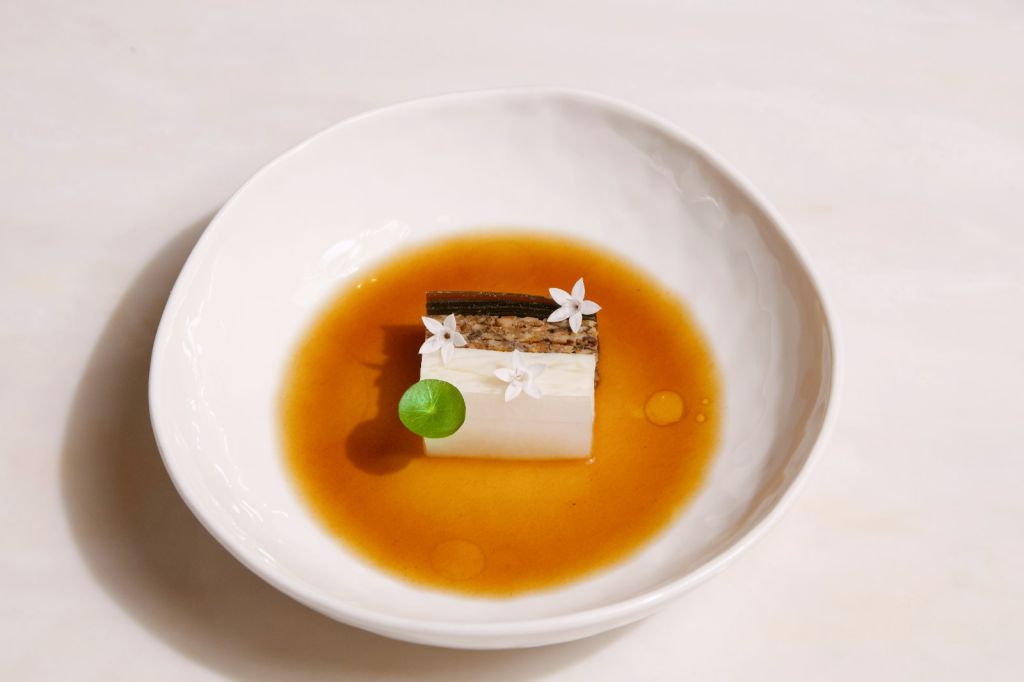 《City Lights城市之光》以黑白色調呈現無聲電影時代的作品,巴西蘑菇、羊肚菌、牛肝菌等昂貴食材與蘿蔔、山藥等平凡食材相互堆疊,比喻電影故事裡社會階層極大落差的富豪與流浪漢,最後淋上老酒醬汁,象徵喝醉的富豪眼裡所有人都一樣。其實料理也是如此,食材本質沒有貴賤之分,透過不同手法與呈現方式,都可以像賣花女一樣獲得新生。
