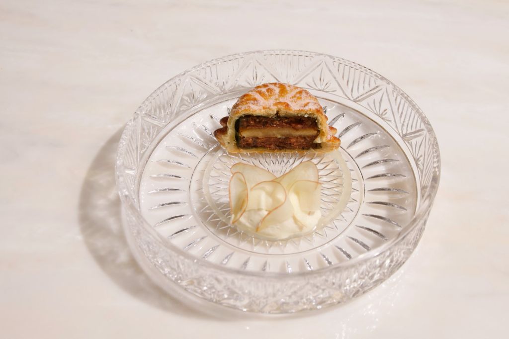 《Snow White白雪公主》以蘋果派致敬迪士尼第一部彩色經典動畫,故事中蘋果的存在是重要元素,特別選用玻璃器皿承裝,搭配透明乳清醬汁呈現魔鏡的高貴與夢幻。