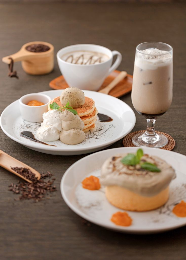 焙茶鮮奶油厚鬆餅頂層滿滿焙茶鮮奶油帶來豐富茶香,點綴自製焙茶醬及風味香甜香桔醬增添風味層次。焙茶鮮奶油薄鬆餅口感Q彈,有焙茶鮮奶油、原味鮮奶油2種風味滑順口感,滋味濃厚焙茶醬、風味酸甜香桔醬展現多重滋味。特別自製焙茶冰淇淋,帶來冷熱交融風味口感。