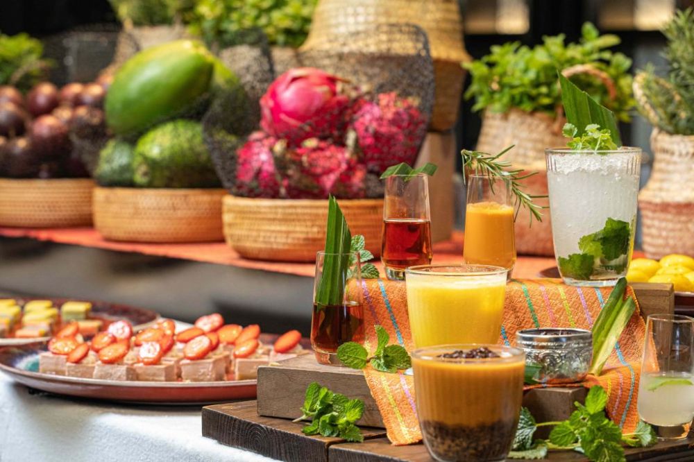步入餐廳,服務團隊先以清爽芳香的薄荷青檸椰子水,或揉合草本及花蜜香氣的香蘭蜜香紅茶為消費者轉換度假感用餐心情,入座後有專人送上泰式宮廷開胃小點一口泰。