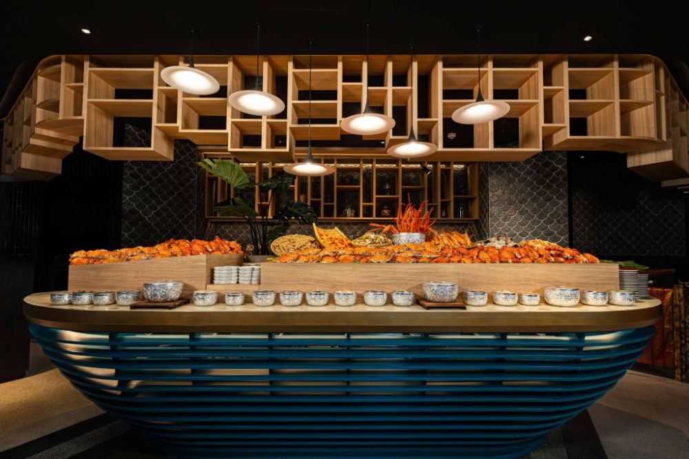 全新登場泰市場海鮮自助餐占地154坪,規劃149個座位,包含1間可依需求調整的半開放式包廂,結合紅磚瓦、船身設計風格及窯烤烤爐設備。擁有現流海鮮、熱食窯烤、南洋甜品3大餐區,餐檯料理道數從60道增為90道。