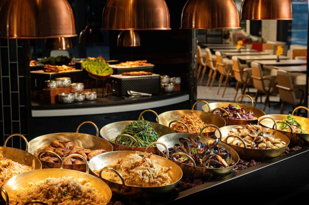 鑊香滿溢的熱食窯烤區,右方是瑪莎曼羊肉串、沙嗲雞、泰式香腸等組成燒烤檯,接著是南薑椰汁水煮魚、辣味椒麻雞、黃金咖哩蟹、極厚月亮蝦餅、蝦醬空心菜及芭達雅海鮮炒飯等多達30道經典泰式佳餚,與現點現切爐烤牛排、現點現煮泰式海鮮湯將輪番上陣。