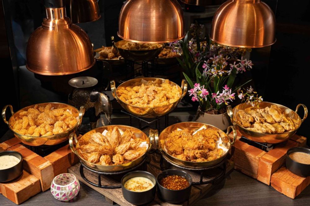 全新推出的泰式風味披薩將由服務人員定時派送,熱騰騰上桌。最左方擺滿5~7款閃耀著金黃色澤的經典泰式炸物,包括極厚月亮蝦餅、金錢蝦餅、椒麻炸雞、酥炸榴槤等,豐富品項期待滿足賓客味蕾。