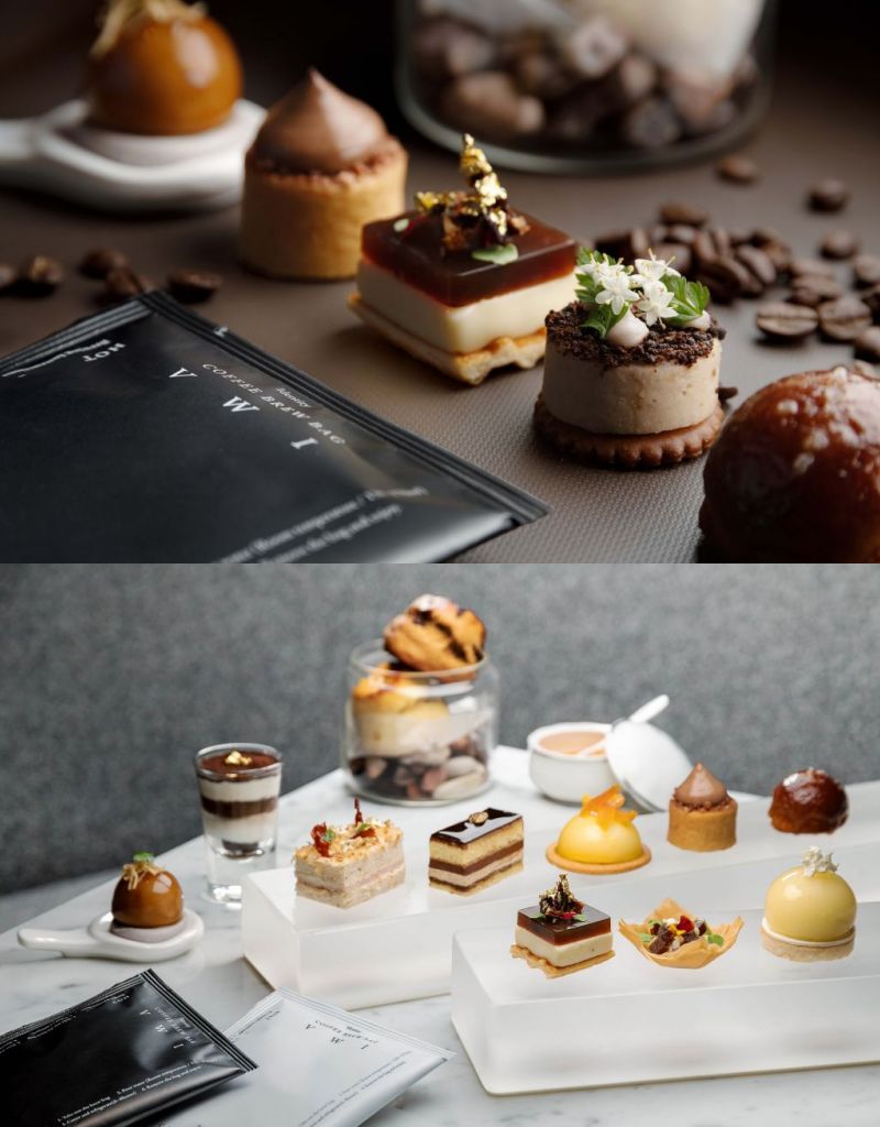 高雄洲際酒店西點主廚陳一輝(Marvin Chen)表示,一般咖啡口味甜點使用成份主要為咖啡濃縮液,為避免咖啡豆沖煮後新鮮咖啡融入甜點後,風味被其他成分蓋過,本次特別精選適合搭佐咖啡的甜點作為設計出發點,將VWI精選咖啡豆代入鹹點,佐以栗子、核桃、杏仁等與咖啡口感契合的核果,特製出12道甜、鹹茶點品。