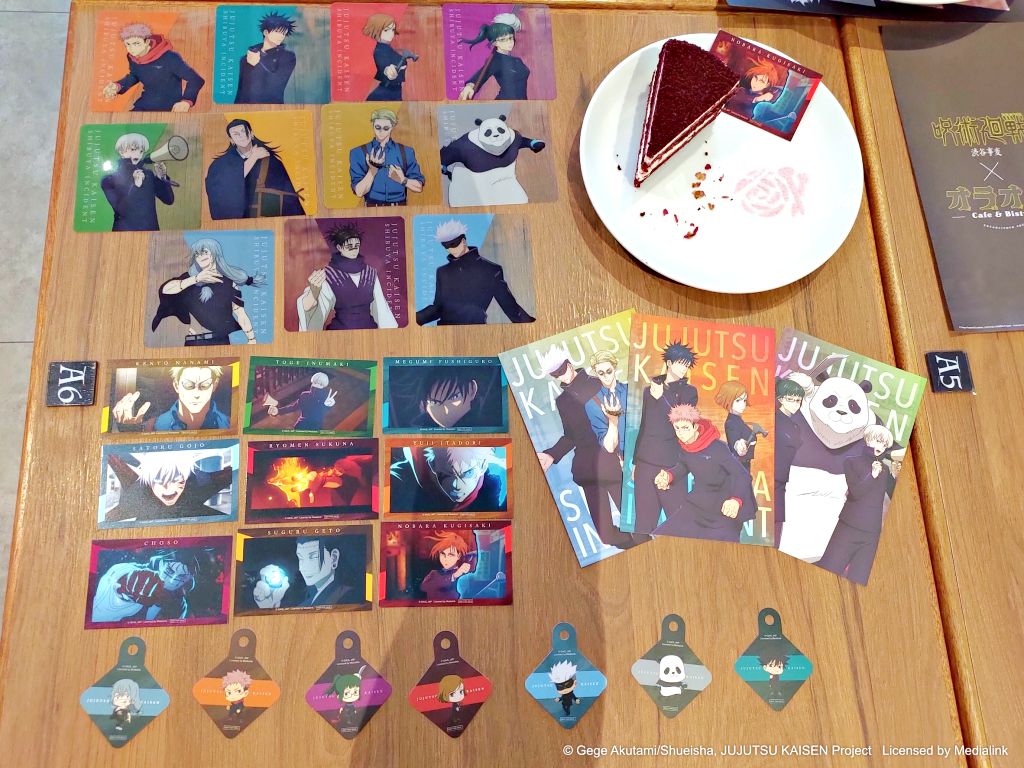 甜點有釘崎野薔薇"共鳴"紅絲絨蛋糕、夏油傑"羂索"袈裟檸檬塔、狗卷棘"不准動"德國起司布丁,與脹相"百斂穿血"藍莓起司蛋糕4道,及虎杖悠仁"黑閃"莓果茶、伏黑惠"脫兔"抹茶歐蕾、禪院真希"我會成為禪院家當家"蝶豆花檸檬氣泡飲、熊貓"我就是熊貓"珍珠厚鮮奶、反派方真人"無為轉變"藍柑橘歐蕾等7款飲品。