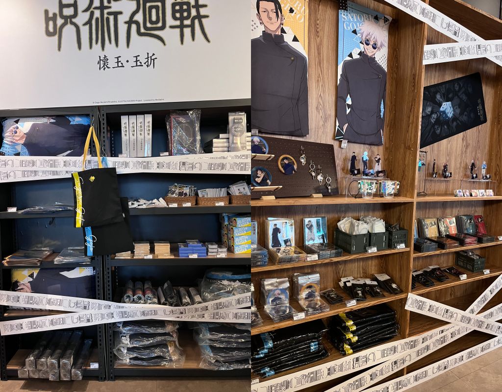 台北西門店佈景直接打造許多名場景,像被詛咒師伏擊的大樓屋頂、伏黑甚爾激鬥中的大樓殘壁、沖繩遊玩的海邊、天內理子的意識流海洋。台中逢甲店從遠處就可以看到五條悟、夏油傑、家入硝子在門口迎接大家。窗戶還貼有"懷玉.玉折篇"主角群立繪,滿滿地青春校園感等著來體驗。