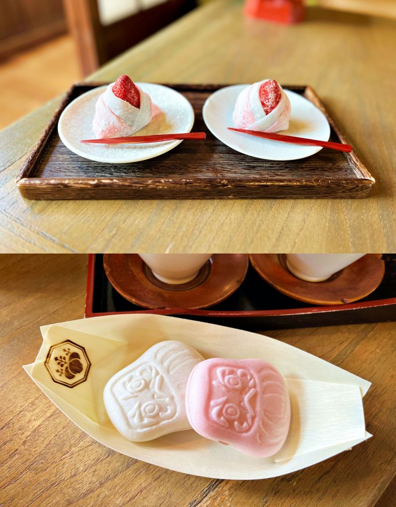京町山本屋以女兒節雛人形玩偶為發想,製作出美味的草莓姬大福。外皮採用白色、粉紅色麻糬,猶如女兒節雛人形和服般優雅,內含大顆鮮嫩欲滴草莓與低糖紅豆餡,口感絕妙。