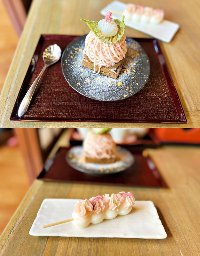 櫻花蒙布朗以焙茶海綿蛋糕為底,櫻花鹹味、抹茶香氣、綿密紅豆泥、焙茶蛋糕口味融合堆疊層次豐富,呈現櫻花粉色絕美視覺饗宴。櫻花串糰子櫻花餡料做成櫻花造型,鋪在白色串糰子粉嫩又典雅,搭配串糰子非常夢幻。