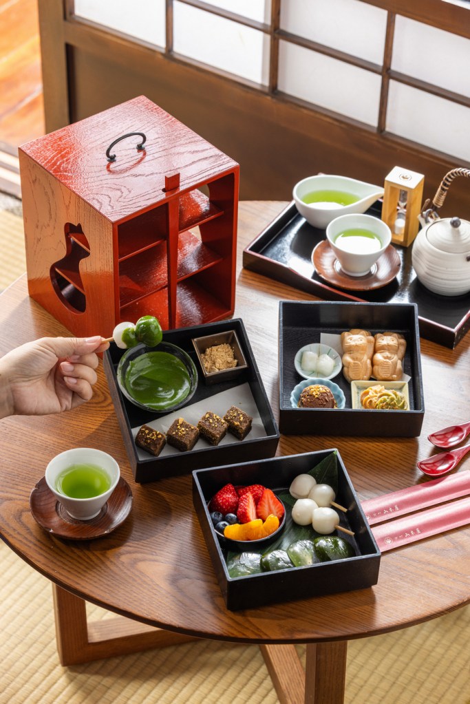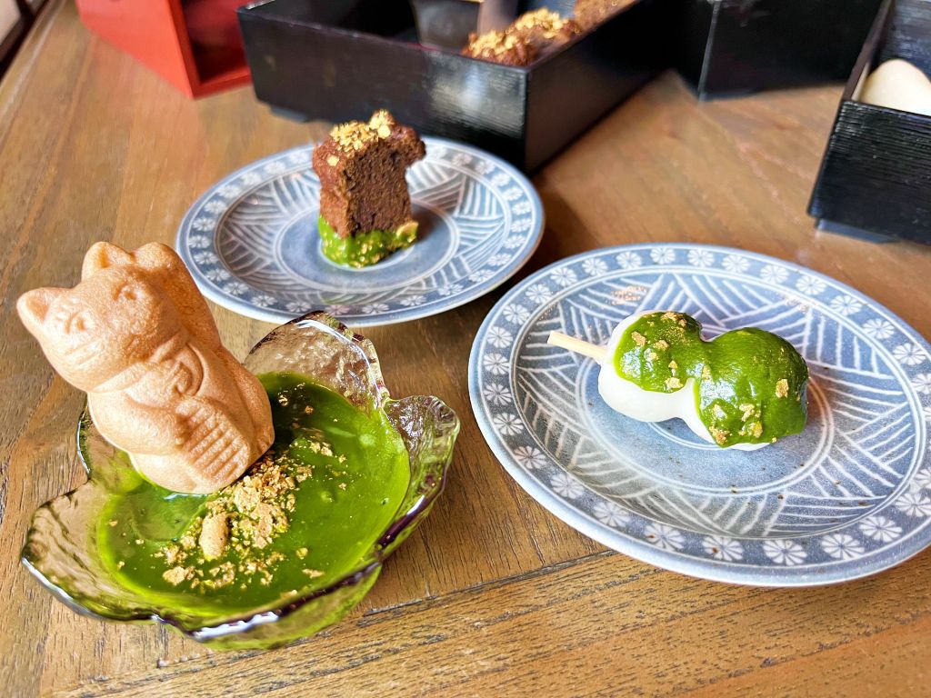 沾著撒上金箔脆片的焙茶費南雪,感受兩種茶類香氣,中層木盒為季節水果、純米串糰子及和三盆蕨餅與抹茶,最上層木盒以玄米茶及黃豆粉組成和風擠花餅乾,招財貓最中需要動手DIY組合製作,將巧克力餡、白玉填充到最中後享用,是這套下午茶最大樂趣之一。
