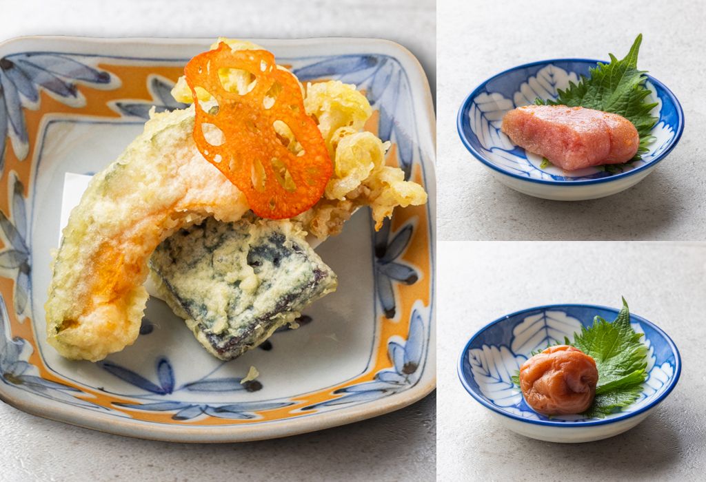 茶泡飯除了原本配料,還備3款加購配料:紀州南高梅內餡豐滿、鹹甜適中、入口即化,沾裹了紫蘇葉香氣,滋味難以忘懷。福岡YAMAYA辛子明太子能增香提味。季節野菜天婦羅包含蓮藕及3款時蔬,帶來自然世界的美味能量。