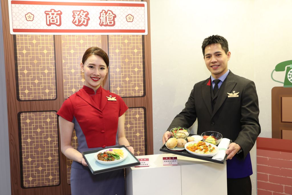 豪華經濟艙前菜梅汁沙拉鮮時蔬、主菜米香麻油松阪豬肉飯及經濟艙主菜米香糖醋雞丁飯。香氣馥郁的古早味麻油與松阪豬翻炒,配上米飯令人食指大動;糖醋雞丁是享譽國際的台式經典菜色,酸甜好滋味在高空飄香。