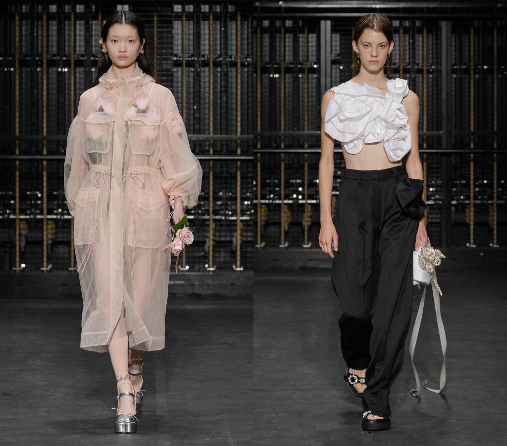 SIMONE ROCHA 2024春夏系列以傳統英式婚禮為整體風格主題,大玩花朵、蛋糕、婚禮薄紗等婚禮必備元素,將多種素材巧妙運用在各項單品設計,襯衫、背心、洋裝、風衣等多種春夏單品,及褲裝或裙裝腰間大量以布料皺褶堆砌出立體玫瑰花朵輪廓,一枝枝玫瑰花朵藏縫在薄紗布料間、風衣等,表現優雅浪漫視覺感受。